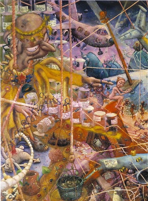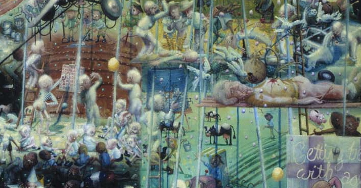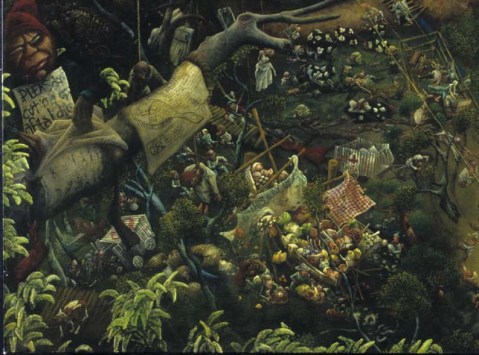 The middle panel shows the South Pole, a mountain of frozen dog shit, surrounded by flags that didn’t quite make it. Young women endlessly exercise on their sleigh pulled by old fat ladies, the misery from fear of aging making the adjustment to old age more bearable and even a relief. Explorers are driven on sleighs pulled by their fears of the future. Cows, whose udders are bursting with milk, drag the coffins of their children to the pole.The final destination – the pole itself – is a flyblown mountain of dog shit, a result of misspent resources and excess energies of polar expedition.