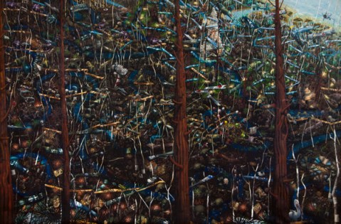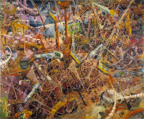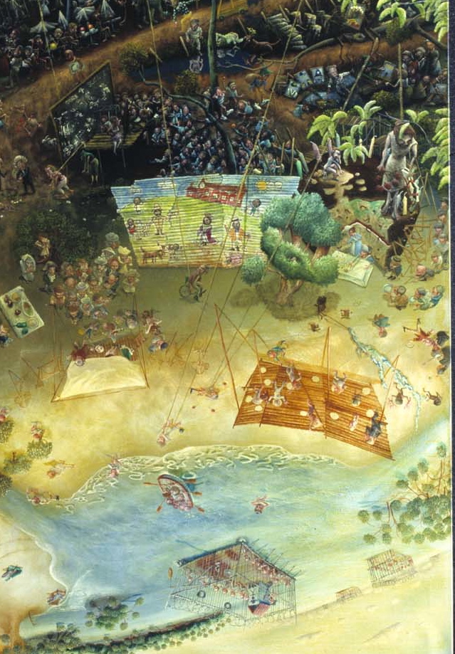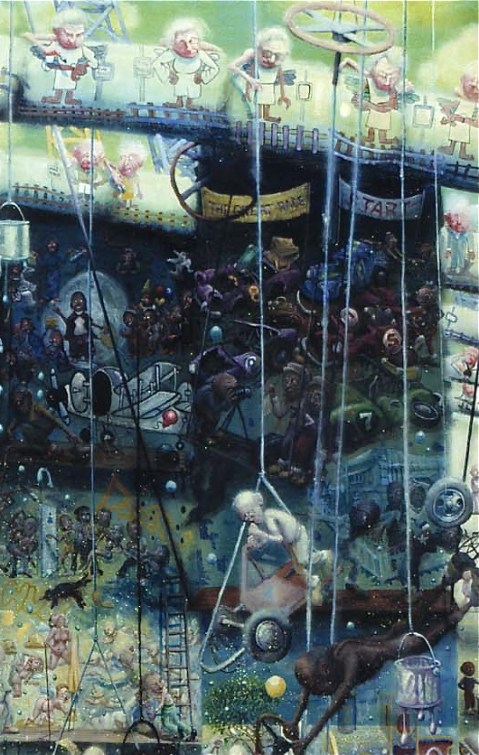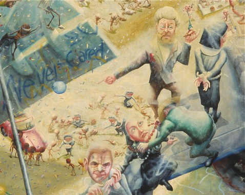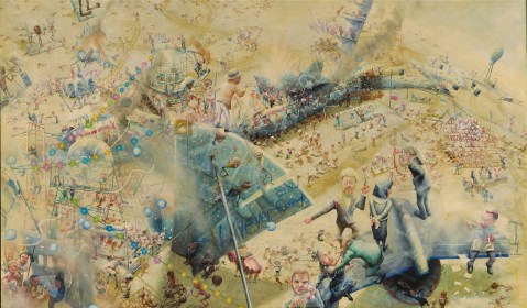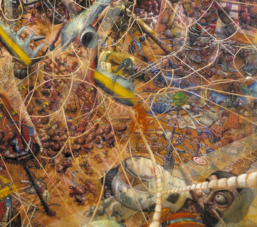 From the air we all felt sorry for the sick and starving by Cameron Hayes. 1997, oil on linen, 51 x 87 inches.