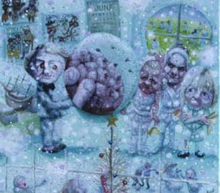The panel on the left is of the explorer, Scott, as a young man already displaying signs of his compulsive behaviour by showing his envious sisters his uneaten Easter egg in July, though now it has turned powdery, white, flyblown and thoroughly inedible. A snowflake which has drifted across from the snowy central panel to summer, magnifies this detail. and tearfully covering his new schoolbooks on Christmas day.