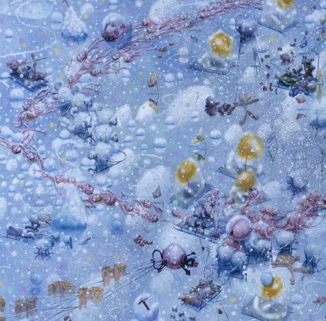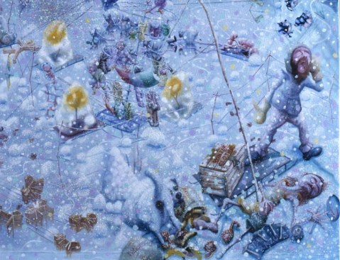 In the South Pole the explorers were so afraid of not having enough food for winter that they starved to death in summer, 2001-2, oil and glitter on linen, polyptych 74 x 100 inches overall.
