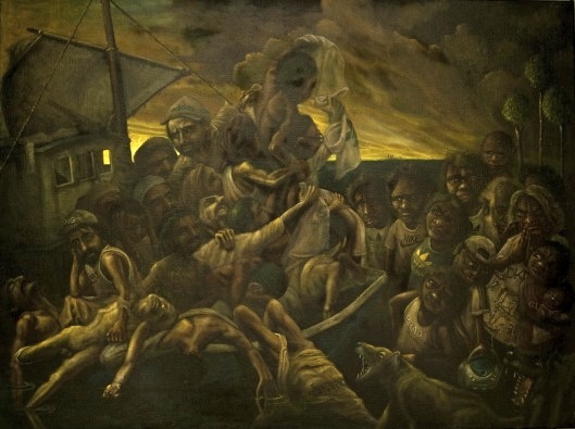 “The latter work referencing the sinister use of marketing in politics and the media. Based on a true story, a group of refugees were spotted on a vessel in the bay at Milikapiti. The conservative Howard Government of the time did a fantastic job of instilling a fear and hatred campaign of refugees through the media, basically branding them as potential terrorists and possible carriers of unknown diseases. It worked. So pervasive was this strategic political message that it even reached across the nation from capital cities to remote small communities. So here we have asylum seekers in the guise of The Raft of the Medusa, instead of ragged cloth they are waving brand name t-shirts representing our new dominant culture – the well marketed Brand. Would they have more success by appealing, not to empathetic fellow people, not to other displaced victims, but to those who like the same brands – who do you identify with? Are you Nike or more of a Burberry? Are you Apple or PC? Are you Right or Left?”