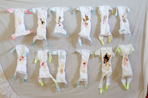 “The humour found in the incongruous meeting of cultures has also been used in the soft sculpture installation The Hunters, 2012. Three elderly women are going hunting. They are wearing inappropriate t-shirts. Those who have ever lived in remote communities would recognise such a scene. Often there is only one shop with limited stock, usually the clothing range is t-shirts featuring popular rap bands, song titles and slogans, or multi-national brands. Here Hayes has used the lyrics from a song called “Horny” (yes, really) by Mousse T, a ludicrously banal pop song that was very popular on Australian radio. The figure is also carrying a ‘Hello Kitty’ bag, one of the world’s largest brands it has permeated nearly every remote corner on earth! The incongruity of the cuteness, the inappropriate slogans, the blood, and carcases – it displays the unique way of life, the idiosyncrasies of the Tiwi people. Hayes also uses this simple, funny scene as a metaphor for what he describes as an ‘ill-fitting culture’. The European choices, the white Australian lifestyle just doesn’t quite meet the women’s needs.” – Marielle Soni, June 2012