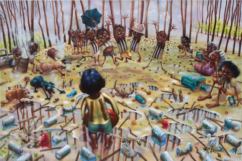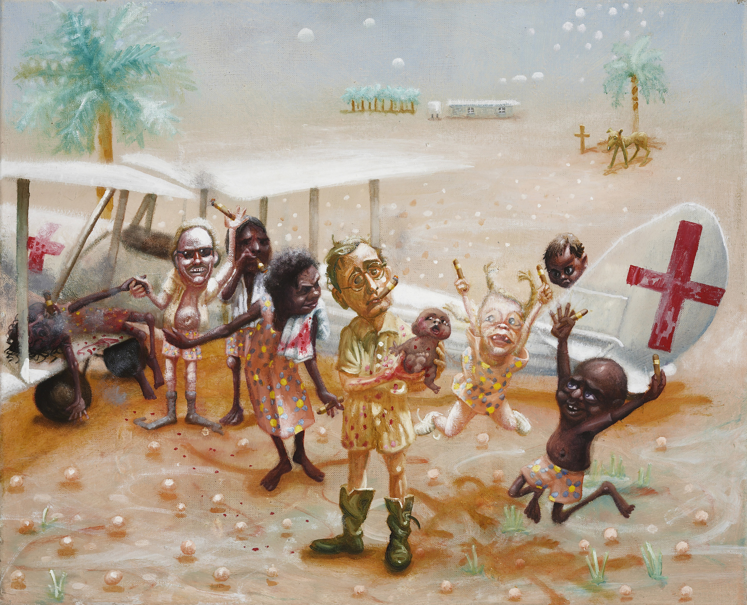 “History is subjective, people can pick out events and stories that they think are important.” And that is what Hayes is referring to by making up past dates to accompany the images in this body of work. This painting (above) was painted in Milikapiti. The artist’s local neighbours would visit him at work, an easel set up under the house. This painting was quite popular. Someone suggested it should be on display in the community club; another neighbour found it funny , stating it reminded her of how it used to be when she was a child. The community now has strict regulations regarding alcohol consumption, no alcohol was permitted at football matches while the artist was there. Hayes says of this work: “The main part of the story is how white Australian culture tries to order Tiwi life. In the background rubbish is burnt (Tiwi) rather than collected – rubbish pile burn offs, and this helps to explain why they are all over the field. One as an aesthetic device and two to reinforce the theme of the picture. Two ways of handling a problem in concert. Football is another analogy for white culture trying to order Tiwi life according to their rules, in this case footy rules. Here the whole team is standing on the mark, opposing team members are hugging. The rules work to a degree, but are adapted by the local culture, not fully accepted.