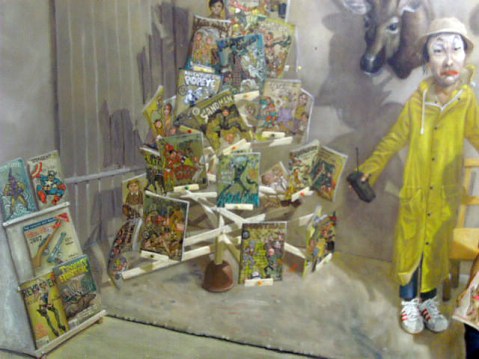 The two men of uncertain masculinity had surrounded themselves/their lives with ultra male objects ; toy soldiers, army equipment, hunting trophies, super hero comics, gun and hunting magazines. Their stall looked like a plea for us the public to confirm/buy their maleness.