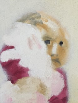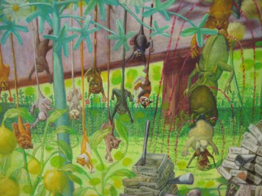 In the picture my father as the repo man is taking back the one thing the family feared the most – the TV. In an effort to stop the repo man an aunty on my father’s side is showing some leg to stop the repo man, while an uncle on my father’s side is offering one of my sisters as a trade for the T.V. My oldest sister has dressed up in her best first communion dress to beg for the T.V. In the background far corner of the room I’m holding tight what I feared most the repo man would take – my pet rabbit.