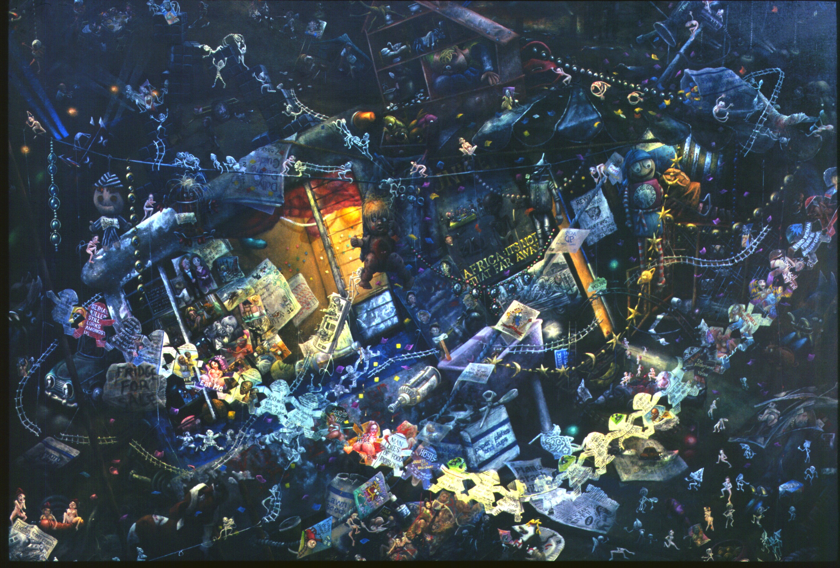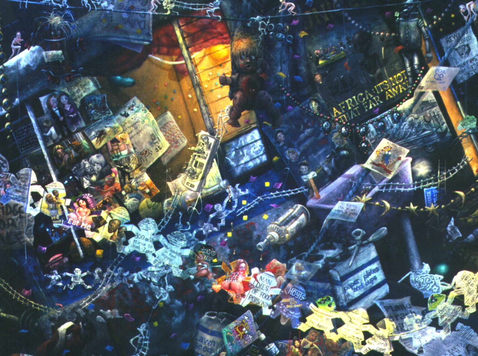 He has cut a chain of paper dolls from a newspaper where serial killers hold hands with victims of war, who hold hands with spread legged women, with a plane crash of 99, with a rapist soldier, with movie ads, with oral sex, murder, football scores, they are all the same linked chain. They are all of equal value.