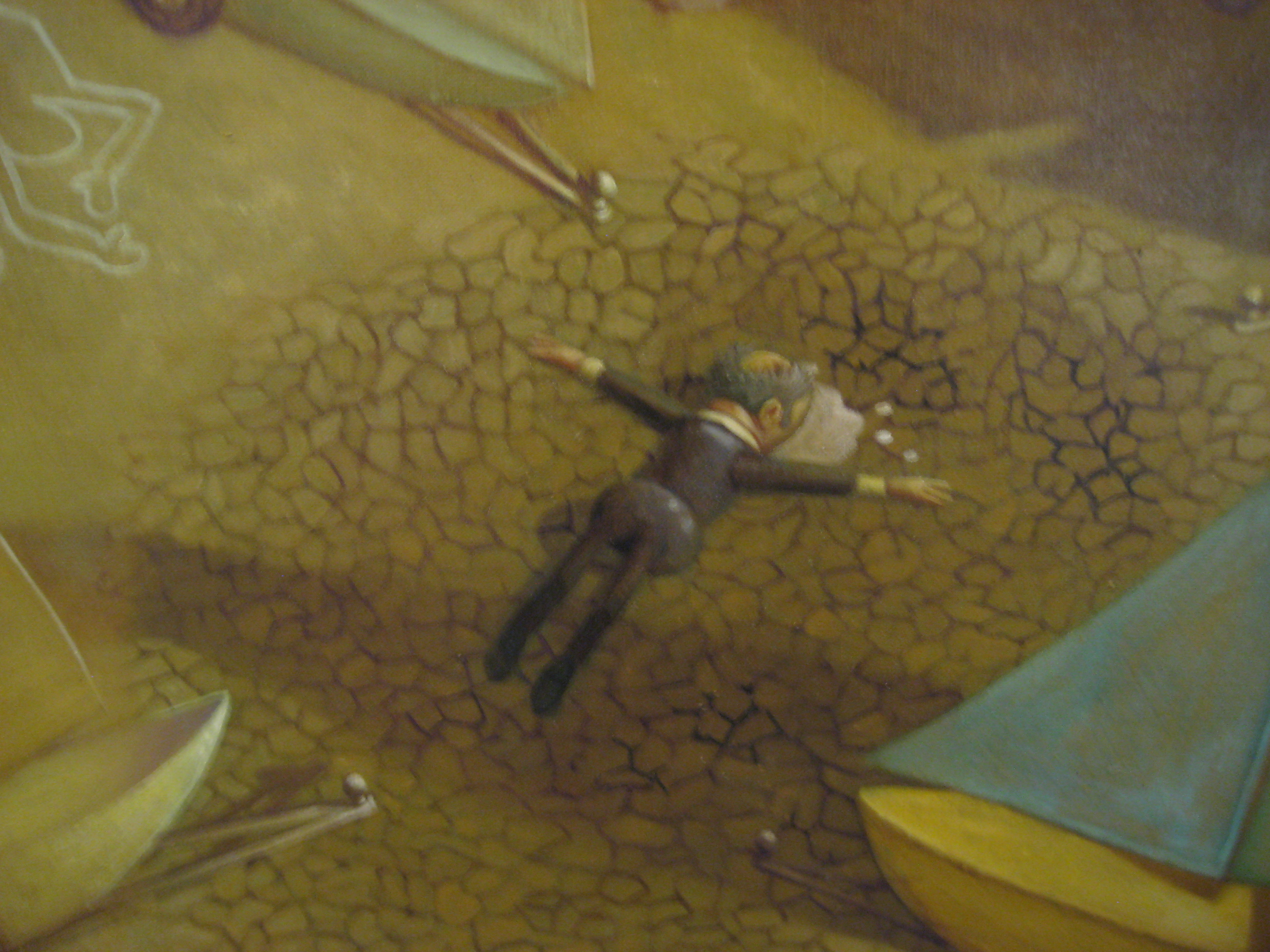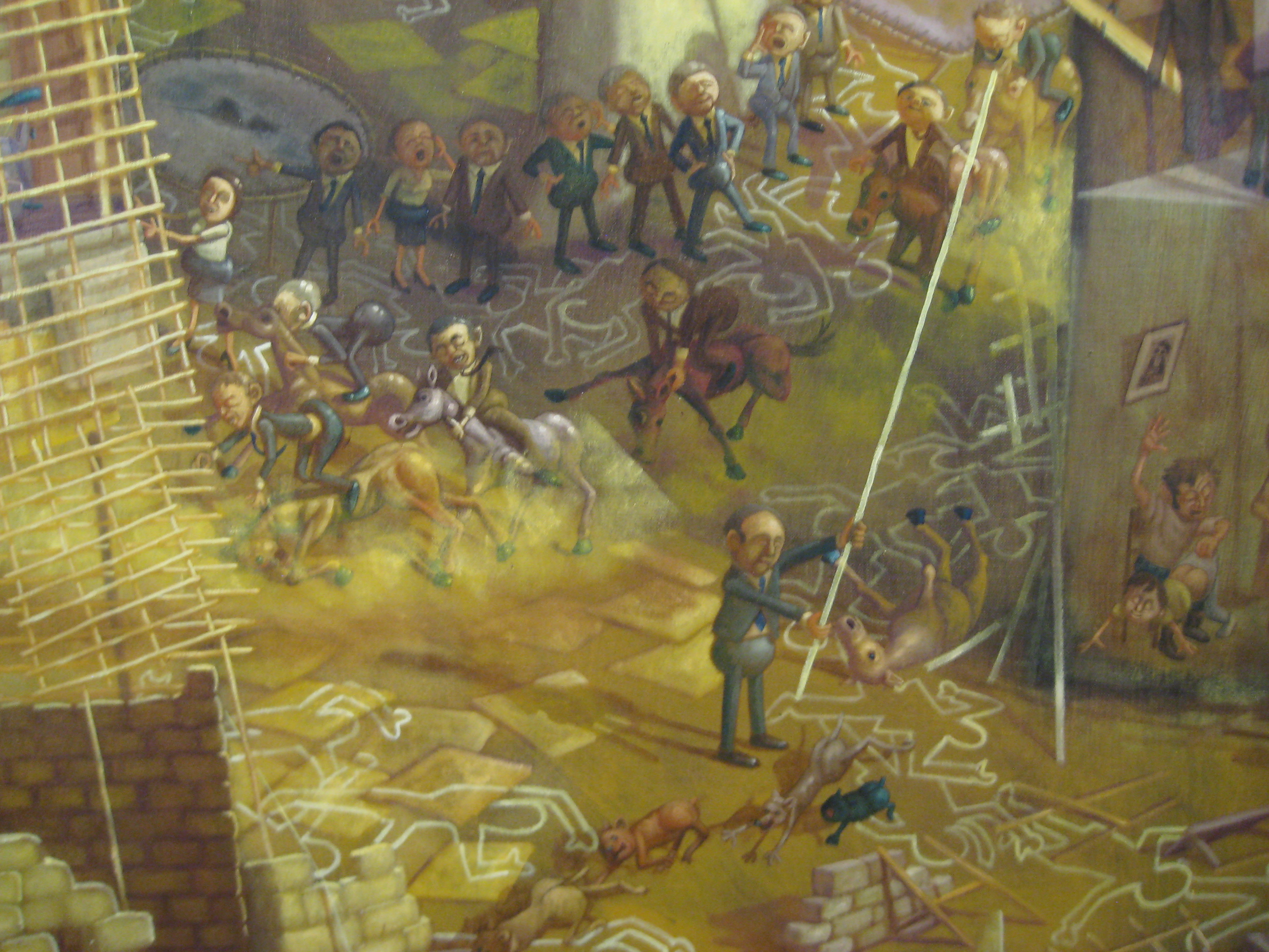 In 2008 I was in Xinjiang province in the northwest of China. Xinjiang was the last province incorporated into modern China by Moa it was mainly full of farmer Muslims from the neighboring….stans they are called Uyghurs, or Uighurs or Uigurs pronounced wee-gars. The CCP is trying to breed out the Uyghurs by subsidizing Han (native Chinese ) Chinese to move to Xinjiang and take all the powerful jobs at the same time jailing (re-educating ) as many Uyghurs as they can without attracting too much criticism. The painting shows a Han Chinese business party at a traditional Uyghur restaurant. The Uyghur restaurant owner is carrying another sheep to be slaughtered for the Chinese through the restaurant, the sheep starts crying when it sees his family members on the plates of the Chinese business party – amixture of fear for himself and grief for his family.